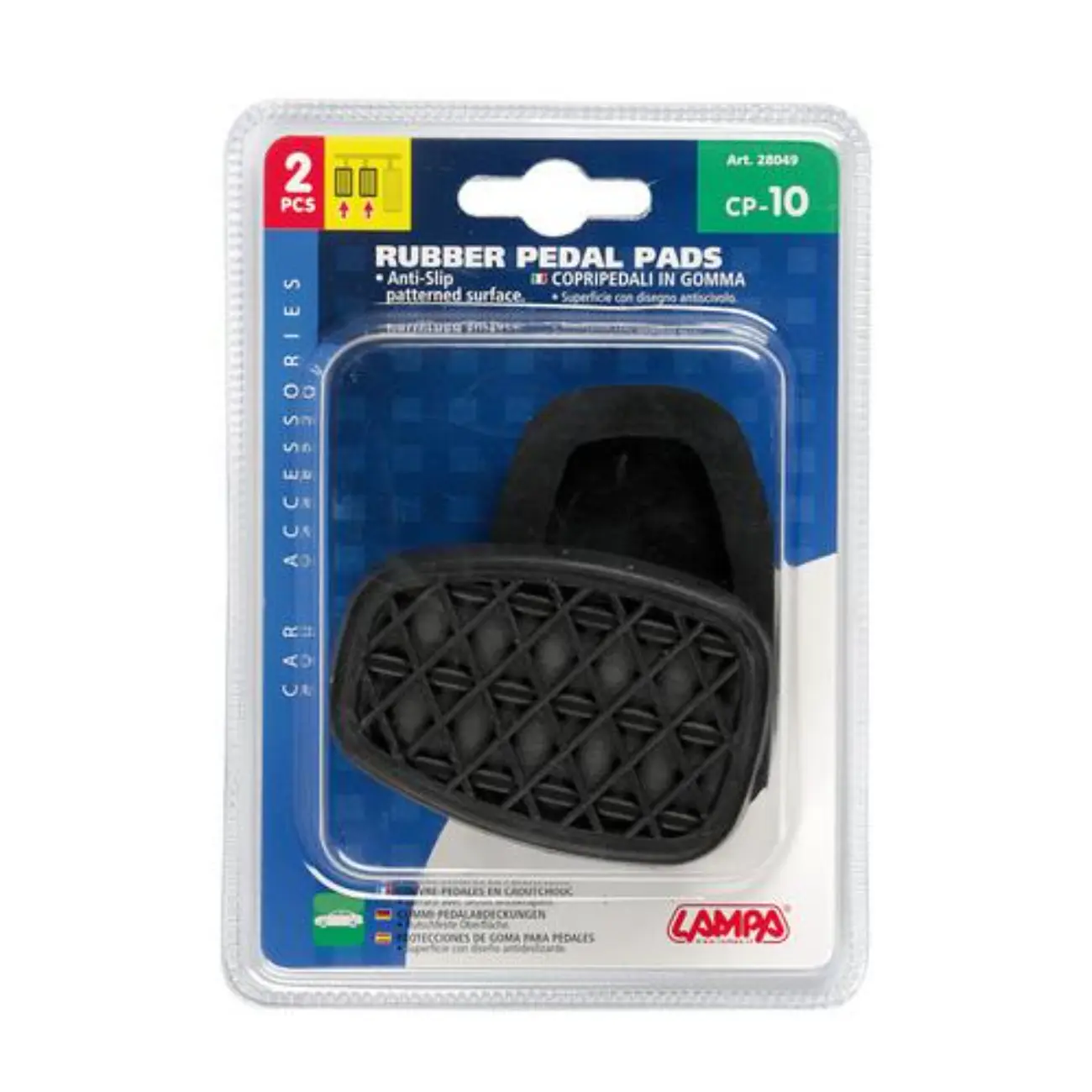 Αντιολισθητικά παπουτσάκια για τα πεντάλ του αυτοκινήτου σας από την εταιρία LAMPA, ιταλικής προέλευσης, για να αντικαταστήσετε τα ήδη υπάρχοντα σε περίπτωση φθοράς ή απώλειας. Κατασκευασμένα από καουτσούκ υψηλής ποιότητας με αντιολισθητικό πέλμα για να μη γλιστράει το πόδι σας κατά την οδήγηση. Η συσκευασία περιλαμβάνει παπουτσάκια για εφαρμογή στο φρένο και τον συμπλέκτη.