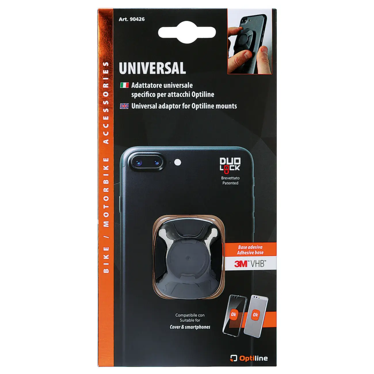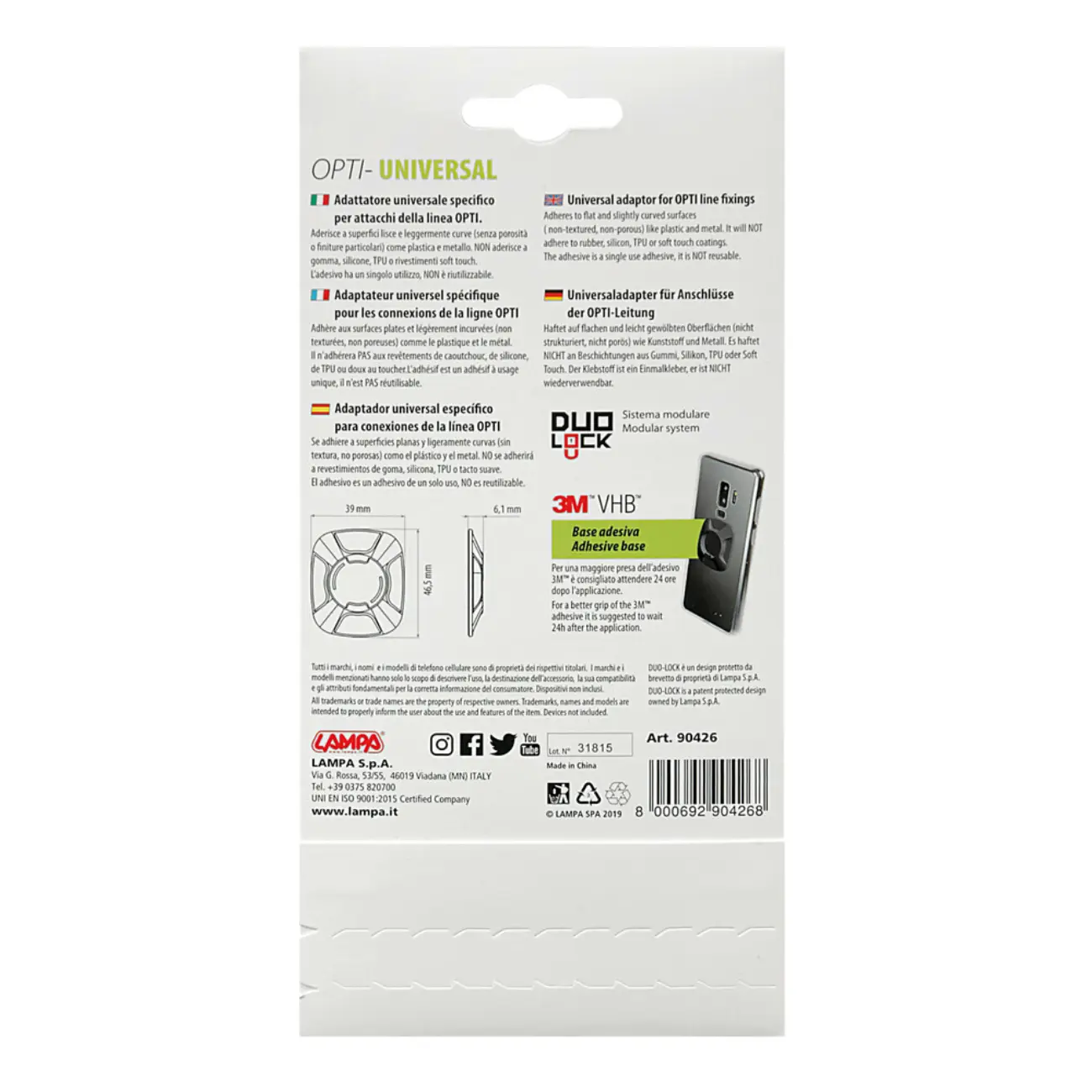 Αυτοκόλλητος αντάπτορας κινητού Universal από την σειρά Optiline της εταιρίας Lampa, ιταλικής προέλευσης, κατασκευασμένος από υψηλής ποιότητας υλικό σε μαύρο χρώμα, universal εφαρμογής με διαστάσεις 39 x 46,5 mm. Είναι συμβατός με όλες τις συσκευές και μπορεί να τοποθετηθεί σε θήκες κινητού ή σε λείες, επίπεδες ή ελαφρώς καμπυλωτές, μη πορώδεις επιφάνειες, όπως πλαστικό, μέταλλο, κ.ο.κ. Διαθέτει ισχυρή αυτοκόλλητη ταινία 3M VHB για απόλυτη σταθερότητα και διάρκεια. Ιδανικό προϊόν για μπορείτε να μεταφέρετε με ασφάλεια το smartphone σας με την μηχανή, την βέσπα, την μοτοσυκλέτα ή το ποδήλατό σας σε κάθε προορισμό. Κατάλληλος για να στηρίζει την συσκευή σας στην βάση στήριξης Optiline, που θα επιλέξετε, ώστε να μπορείτε να κάνετε χρήση του gps, να λαμβάνετε κλήσεις και να έχετε άμεση πρόσβαση στο κινητό σας κατά την διαδρομή! Απολαύστε το ταξίδι σας ή την καθημερινή διαδρομή μέσα στην πόλη με άνεση και εργονομία!