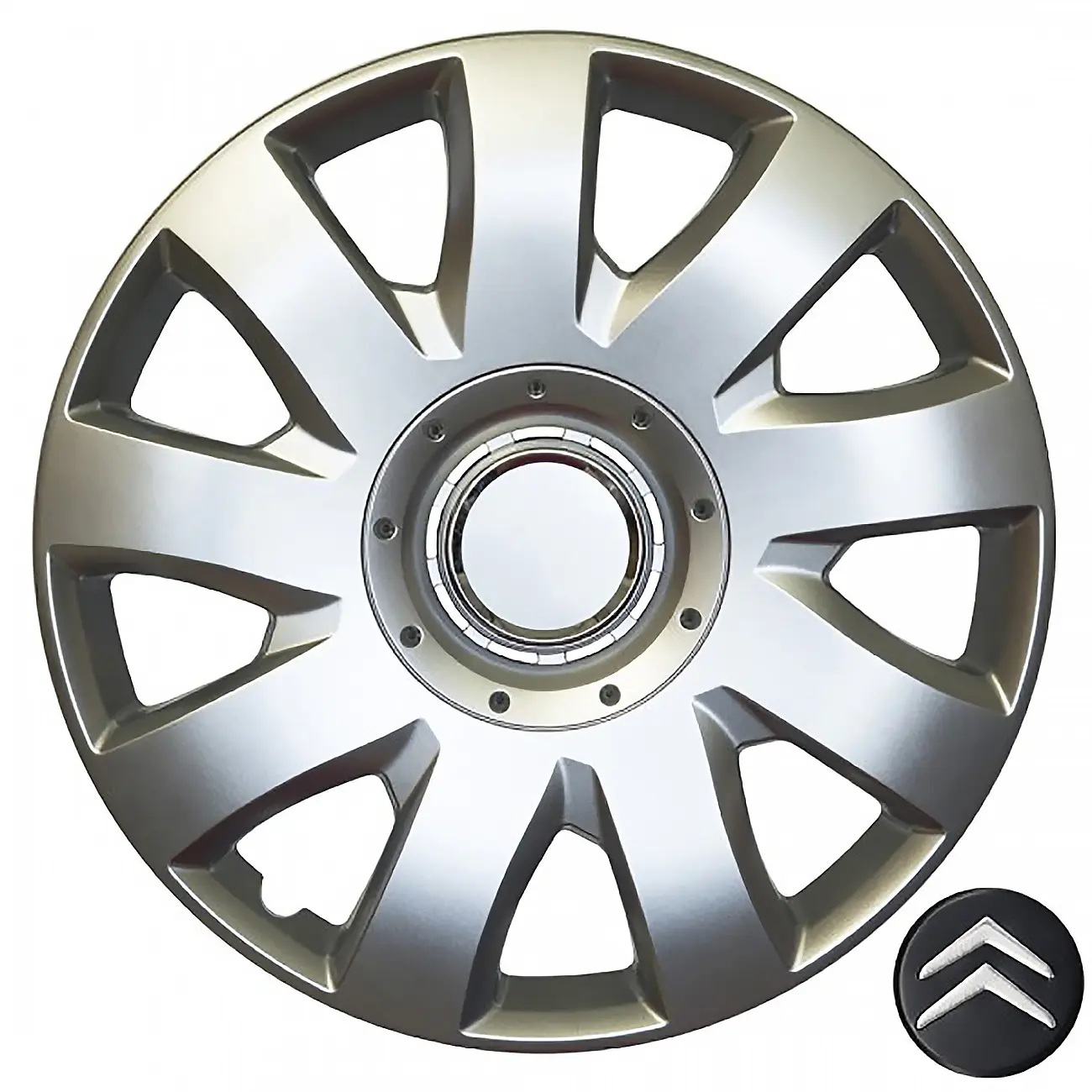 Κατασκευασμένα από υψηλής ποιότητας ενισχυμένο άθραυστο πλαστικό, απόλυτα ελαστικά, βαμμένα σε ασημί γυαλιστερό χρώμα, εξοπλισμένα με νίκελ δακτυλίδια για να στερεώσετε το σήμα της εκάστοτε μάρκας και ειδική εγκοπή για τη βαλβίδα του αέρα των ελαστικών του οχήματος.