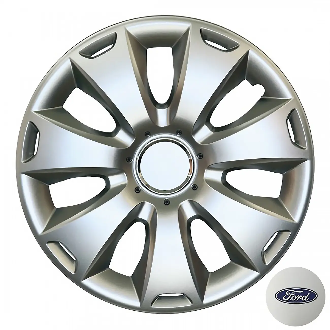 Κατασκευασμένα από υψηλής ποιότητας ενισχυμένο άθραυστο πλαστικό, απόλυτα ελαστικά, βαμμένα σε ασημί γυαλιστερό χρώμα, εξοπλισμένα με νίκελ δακτυλίδια για να στερεώσετε το σήμα της εκάστοτε μάρκας και ειδική εγκοπή για τη βαλβίδα του αέρα των ελαστικών του οχήματος.