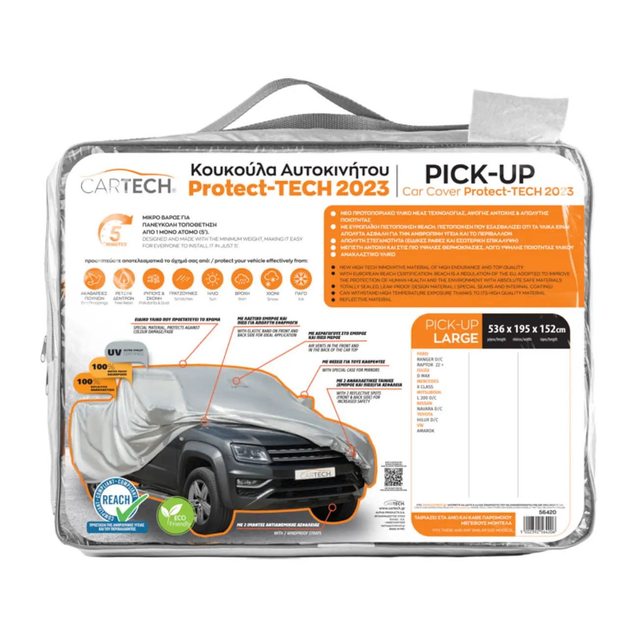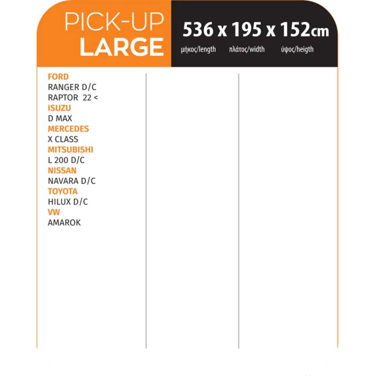 Η αδιάβροχη κουκούλα αυτοκινήτου pick-up large με διαστάσεις 536 x 195 x 152 cm είναι ειδικά σχεδιασμένη για μεγάλα pick-up trucks. Κατασκευασμένη από νέο πρωτοποριακό υλικό νέας τεχνολογίας που προστατεύει το χρώμα, προσφέρει 100% ανακλαστική επιφάνεια με ευρωπαϊκή πιστοποίηση REACH και UV πιστοποίηση. Εξασφαλίζει άψογη αντοχή σε βροχή, χιόνι, σκόνη και υψηλές θερμοκρασίες.