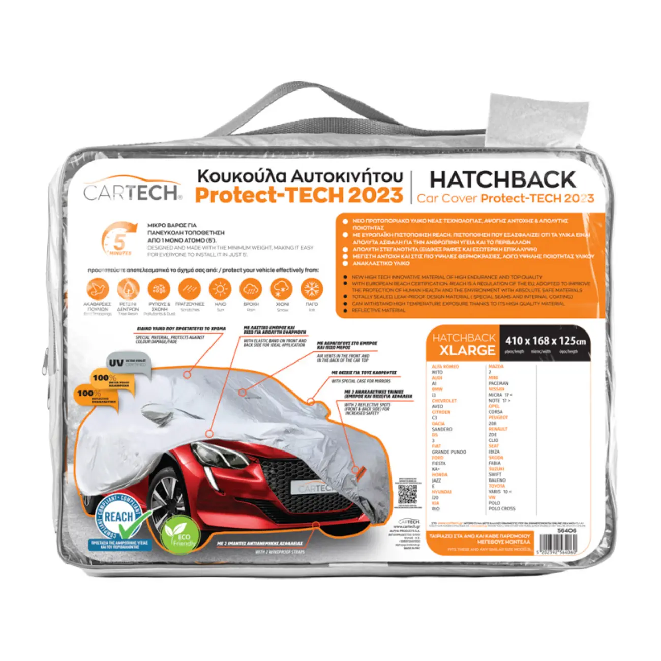 Η αδιάβροχη κουκούλα αυτοκινήτου hatchback XL με διαστάσεις 410 x 168 x 125 cm είναι ειδικά σχεδιασμένη για extra large hatchback και μεγαλύτερα μοντέλα. Κατασκευασμένη από νέο πρωτοποριακό υλικό νέας τεχνολογίας που προστατεύει το χρώμα, προσφέρει 100% ανακλαστική επιφάνεια με ευρωπαϊκή πιστοποίηση REACH και UV πιστοποίηση. Εξασφαλίζει άψογη αντοχή σε βροχή, χιόνι, σκόνη και υψηλές θερμοκρασίες.