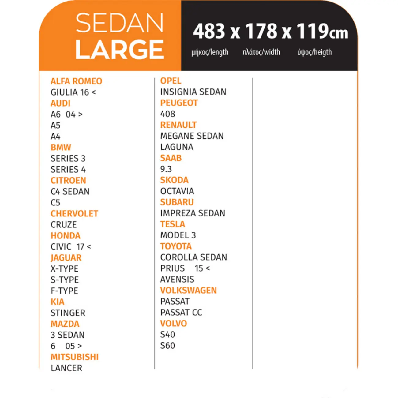 100% αδιάβροχη χάρη σε ειδικές ραφές και εσωτερική επικάλυψη, προστατεύει το μεγάλο sedan σας από όλες τις καιρικές συνθήκες και ηλιακή ακτινοβολία. Διαθέτει αεραγωγούς μπροστά και πίσω για καλύτερο αερισμό, λάστιχο εμπρός-πίσω για τέλεια εφαρμογή και 2 ιμάντες αντιανεμικής ασφάλειας κατά του ανέμου.