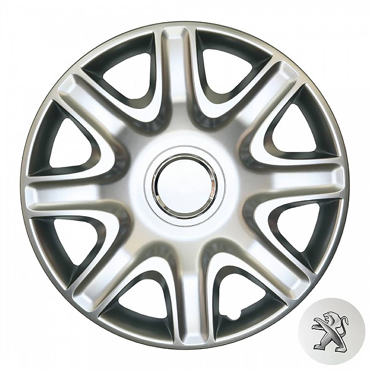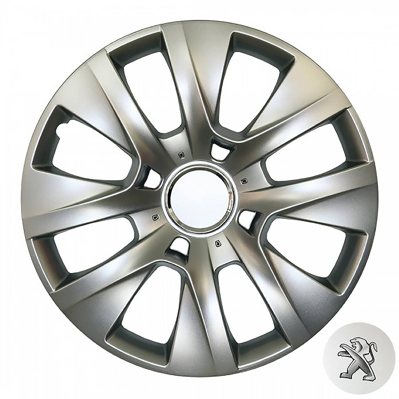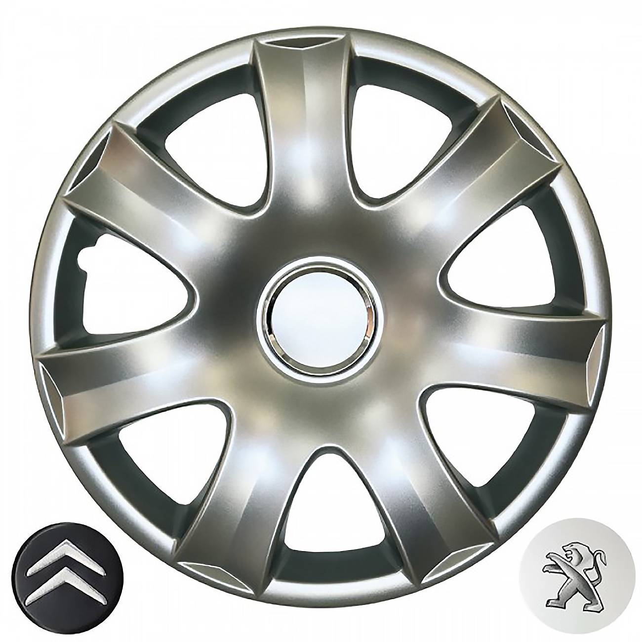 Κατασκευασμένα από υψηλής ποιότητας ενισχυμένο άθραυστο πλαστικό, απόλυτα ελαστικά, βαμμένα σε ασημί γυαλιστερό χρώμα, εξοπλισμένα με νίκελ δακτυλίδια για να στερεώσετε το σήμα της εκάστοτε μάρκας και ειδική εγκοπή για τη βαλβίδα του αέρα των ελαστικών του οχήματος.
