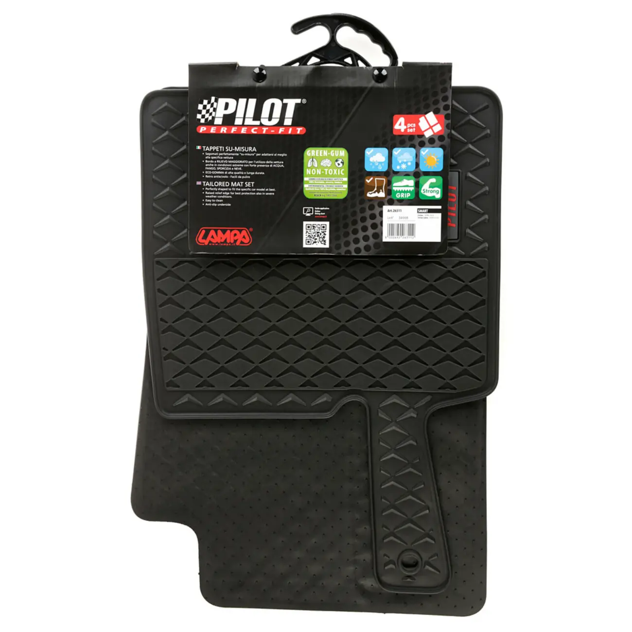 Πατάκια αυτοκινήτου από την εταιρία LAMPA, ιταλικής προέλευσης, κατασκευασμένα από υψηλής ποιότητας άοσμο λάστιχο, το οποίο είναι εξαιρετικής αντοχής, σχεδιασμένα για να ταιριάζουν ακριβώς στις διαστάσεις του δαπέδου του εκάστοτε οχήματος (μαρκέ). Διαθέτουν αντιολισθητικό πάτο για να παραμένουν σταθερά χωρίς να μετακινούνται κατά την είσοδο και έξοδο από το όχημα. Κατάλληλο αξεσουάρ αυτοκινήτου για όλες τις εποχές, ανθεκτικά στο πέρας του χρόνου, παρέχουν προστασία από βρωμιά, σκόνη, λάσπες και υγρασία. Πλένονται και καθαρίζονται πολύ εύκολα, διατηρώντας το αρχικό τους σχήμα. Διαθέτουν κουμπώματα (fixing buttons) για καλύτερη σταθερότητα και πρόσφυση στο δάπεδο. Εύκολη και γρήγορη τοποθέτηση.