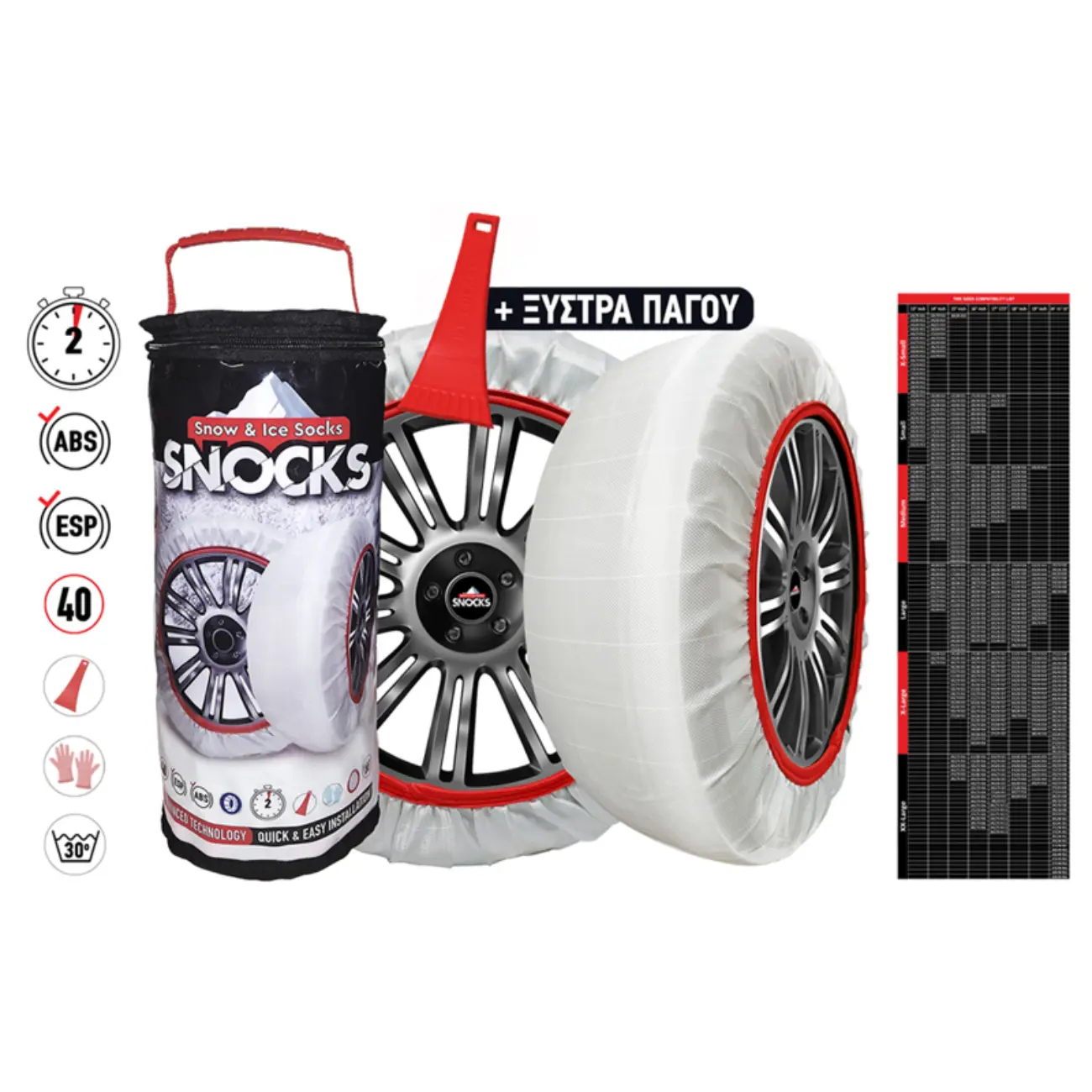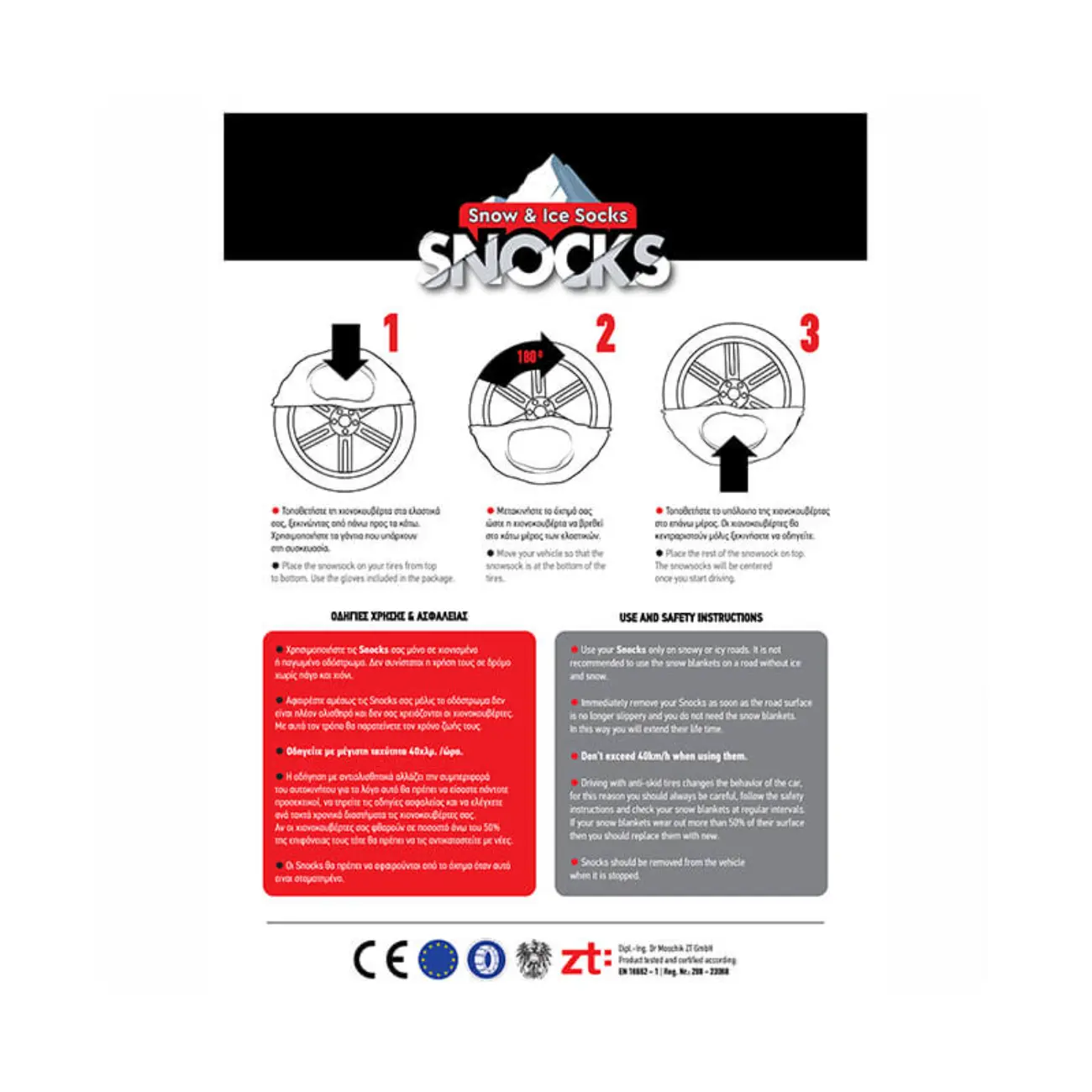 Το Snocks είναι ένα πρωτότυπο ανεπτυγμένο κάλυμμα τροχών, με στόχο να αυξάνει την πρόσφυση των τροχών στο δρόμο όταν οδηγείτε σε πάγο ή χιόνι. Είναι κατασκευασμένα από ύφασμα υψηλής ποιότητας και τεχνολογίας, το οποίο δεν προκαλεί βλάβες στα ελαστικά. Αντικαθιστούν τις μεταλλικές αλυσίδες χιονιού προσφέροντας μεγαλύτερη ασφάλεια και αποτελεσματικότητα.