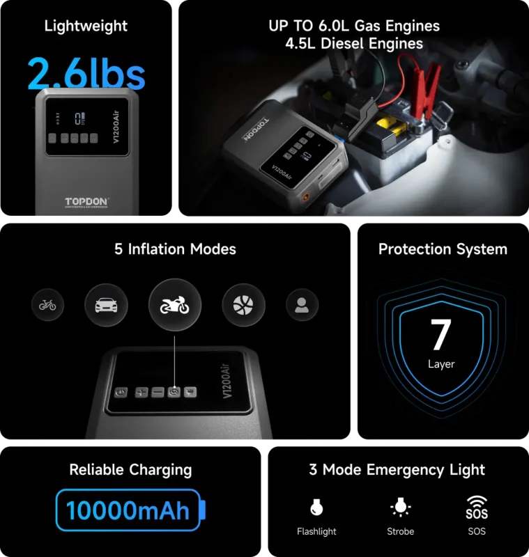 Το TOPDON V1200Air είναι ο απόλυτος σύμμαχος κάθε οδηγού, συνδυάζοντας έναν ισχυρό εκκινητή μπαταρίας και έναν έξυπνο αεροσυμπιεστή σε μία compact, φορητή συσκευή. Σχεδιασμένο για να προσφέρει ασφάλεια και αυτονομία, το V1200Air σάς απαλλάσσει από το άγχος μιας άδειας μπαταρίας ή ενός κλαταρισμένου ελαστικού, όπου κι αν βρίσκεστε.