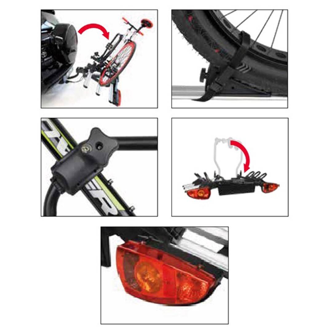 Στο σημείο σύνδεσης με τον κοτσαδόρο διαθέτει ακόμη ένα αντικλεπτικό σύστημα με μοχλό γρήγορης ασφάλισης/απασφάλισης (quick fixing lever/rapid lock). Έχει μηχανισμό ανάκλισης, ο οποίος λειτουργεί με τη χρήση μοχλού χειρός, που βρίσκεται στο μπροστά μέρος, ώστε ν ανοίγει το πορτ μπαγκάζ εύκολα και με άνεση, χωρίς ο όγκος των ποδηλάτων να σας εμποδίζει να φτάσετε τις αποσκευές σας, ενσωματωμένα φανάρια, τα οποία θέτονται σε λειτουργία και ηλεκτροδοτούνται από τον κοτσαδόρο με τη χρήση αντάπτορα 13 pins και υποδοχή για να τοποθετηθεί πλαίσιο με πινακίδα κυκλοφορίας. Είναι πλήρως αναδιπλούμενη, ώστε να μπορεί να παραμένει κλειστή όταν δεν είναι σε χρήση χωρίς να παρεμποδίζει την ορατότητα του οδηγού κατά τις μετακινήσεις του ή και για να αποθηκεύεται εύκολα χωρίς να πιάνει πολύ αποθηκευτικό χώρο.