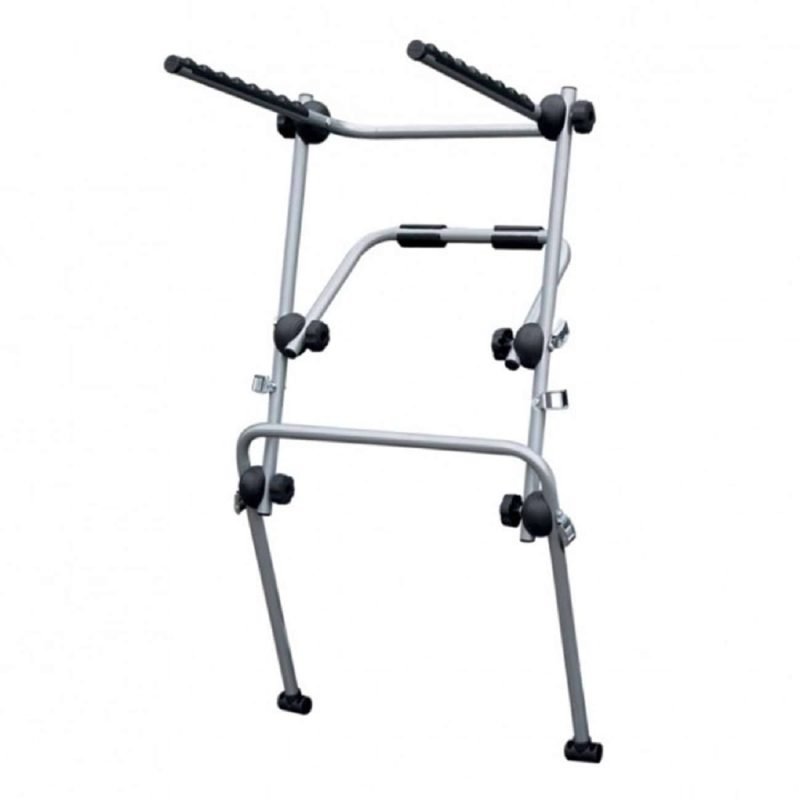 Το πλαίσιο της είναι κατασκευασμένο από ατσάλι υψηλής ποιότητας, ρυθμιζόμενο με ροδέλες, εξοπλισμένο με εξαιρετικής αντοχής ιμάντες πρόσδεσης, οι οποίοι εισχωρούν στις εγκοπές μεταξύ αμαξώματος – πόρτας πορτ μπαγκάζ περιμετρικά και προσαρμόζονται κατάλληλα για τη καλύτερη πρόσφυση, τοποθέτηση και συγκράτησή της σε οποιοδήποτε όχημα. Στο πάνω μέρος έχει 2 ρυθμιζόμενους βραχίονες, στους οποίους το κάθε ποδήλατο στηρίζεται και δένεται με νάιλον ιμάντες για να παραμένει σταθερό κατά τη μεταφορά. Είναι πλήρως αναδιπλούμενη για να παραμένει κλειστή και να μην εμποδίζει την ορατότητα του οδηγού κατά τη μετακίνηση, καθώς και για να αποθηκεύεται εύκολα χωρίς να πιάνει χώρο, όταν δεν είναι σε χρήση.