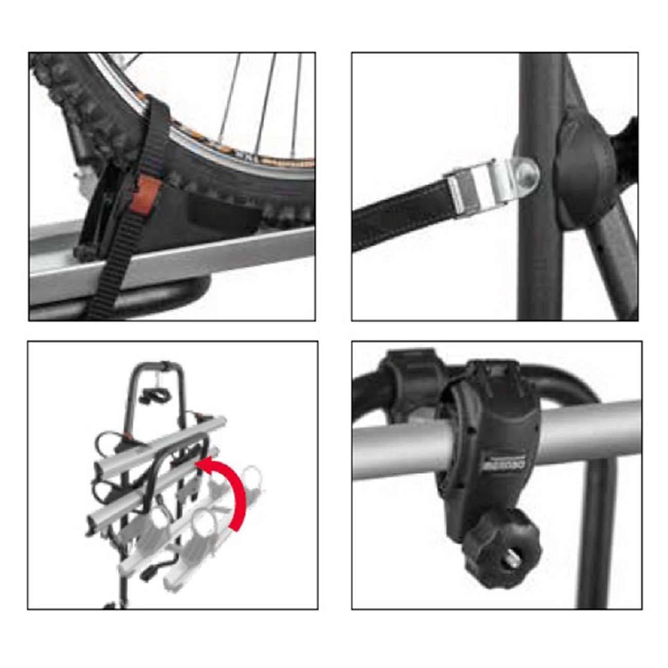 Στο πάνω μέρος έχει 2 ρυθμιζόμενα μπράτσα με ροδέλες για τέλεια προσαρμογή επάνω στο σκελετό των ποδηλάτων, συγκρατώντας τα σταθερά κατά τη μεταφορά ενώ παρέχεται και η δυνατότητα χρήσης πρόσθετης κλειδαριάς (δεν περιλαμβάνεται – πωλείται ξεχωριστά) στο κάθε ένα από αυτά. Στο κάτω μέρος οι ράγες (βέργες) συγκράτησης των ελαστικών είναι κατασκευασμένες από αλουμίνιο και η κάθε μία διαθέτει στα άκρα της 2 κυλιόμενους ιμάντες δέσης (δέστρες) για να συγκρατούν με απόλυτη ασφάλεια και σταθερότητα τους τροχούς των ποδηλάτων.