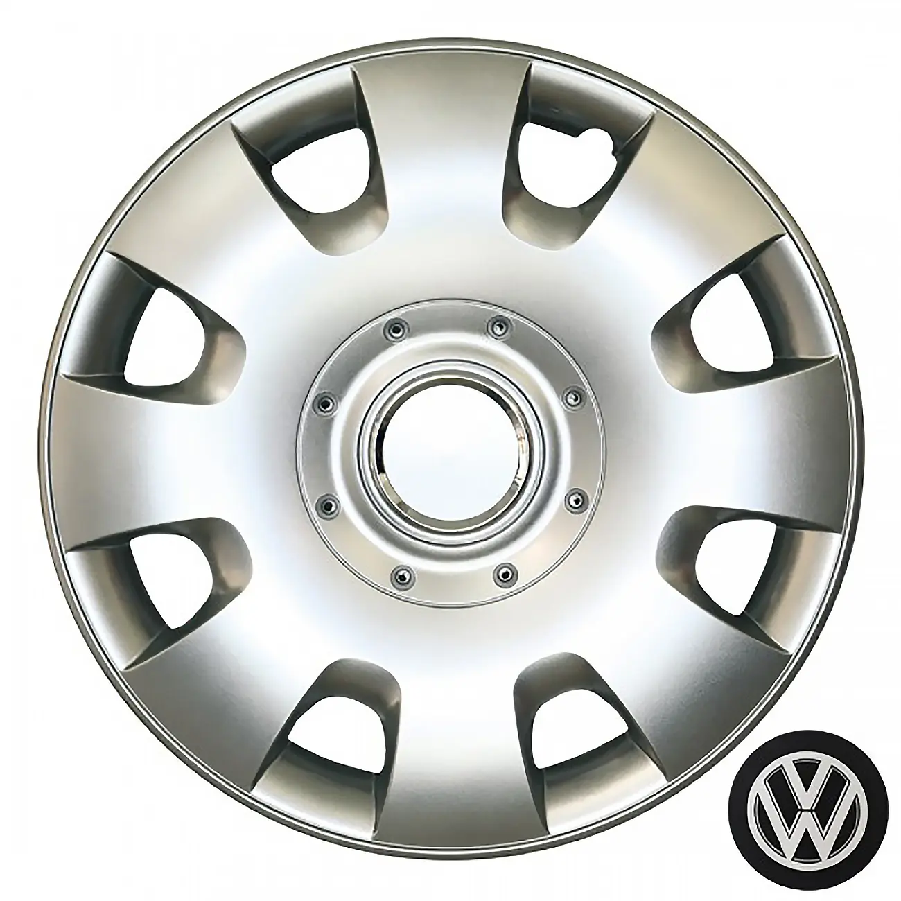 Κατασκευασμένα από υψηλής ποιότητας ενισχυμένο άθραυστο πλαστικό, απόλυτα ελαστικά, βαμμένα σε ασημί γυαλιστερό χρώμα, εξοπλισμένα με νίκελ δακτυλίδια για να στερεώσετε το σήμα της εκάστοτε μάρκας και ειδική εγκοπή για τη βαλβίδα του αέρα των ελαστικών του οχήματος.