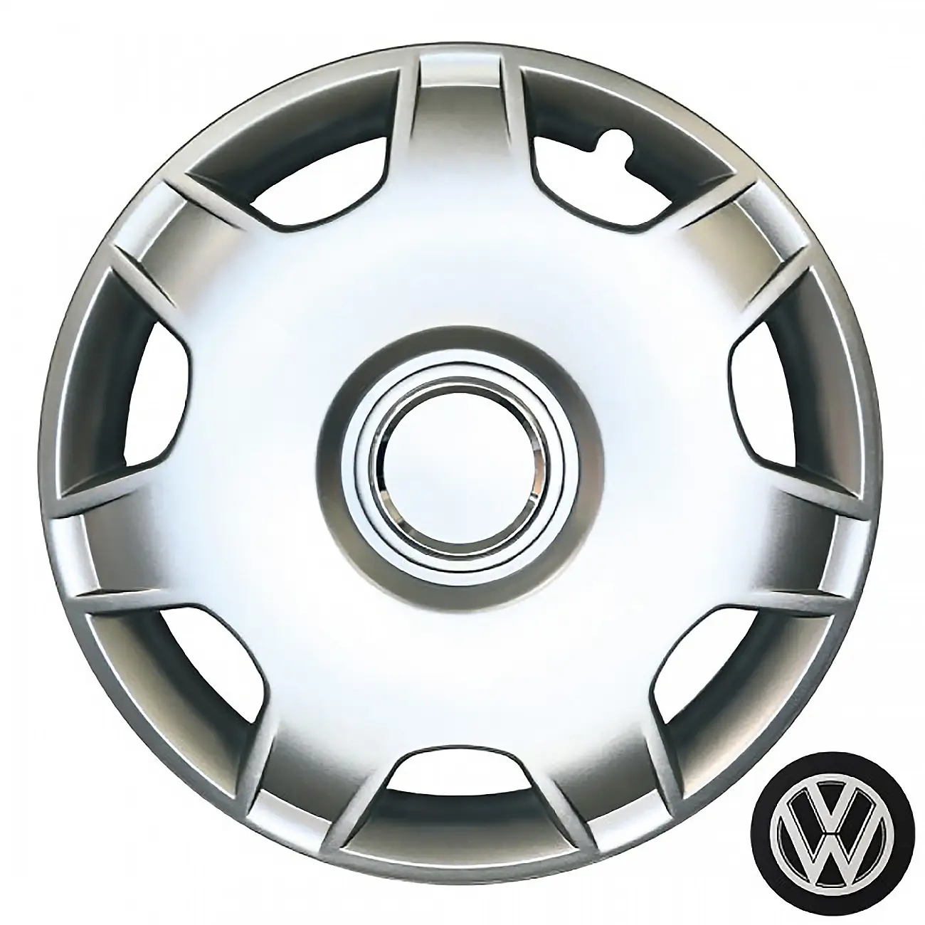 Κατασκευασμένα από υψηλής ποιότητας ενισχυμένο άθραυστο πλαστικό, απόλυτα ελαστικά, βαμμένα σε ασημί γυαλιστερό χρώμα, εξοπλισμένα με νίκελ δακτυλίδια για να στερεώσετε το σήμα της εκάστοτε μάρκας και ειδική εγκοπή για τη βαλβίδα του αέρα των ελαστικών του οχήματος.